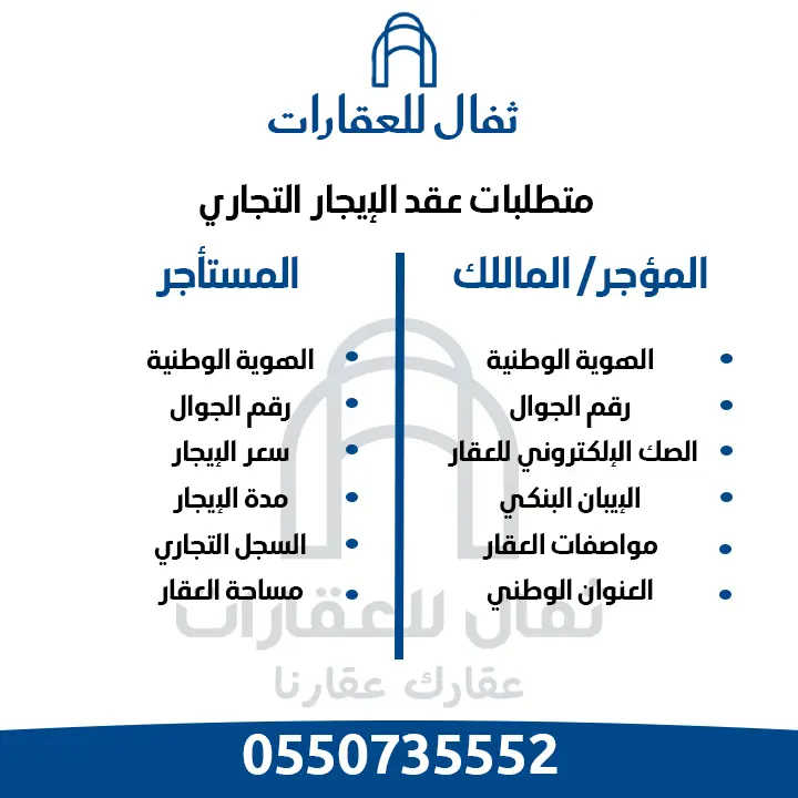 المتطلبات المؤجر/ المالك: الهوية الوطنية رقم الجوال العنوان الوطني الصك الإلكتروني للعقار مواصفات العقار رقم الايبان للبنك فاتورة الكهرباء المستأجر: الهوية الوطنية رقم الجوال سعر الايجار مدة الإيجار السجل التجاري مساحة العقار